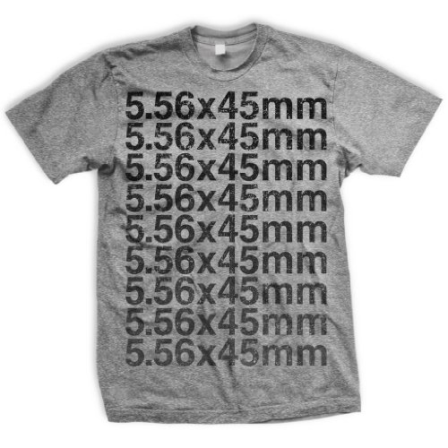 This screen printed t-shirt features repeating gradient text to show your love for the 5.56x45mm NATO rifle cartridge, which is the military higher pressure metric child of the ubiquitous .223 Remington cartridge.